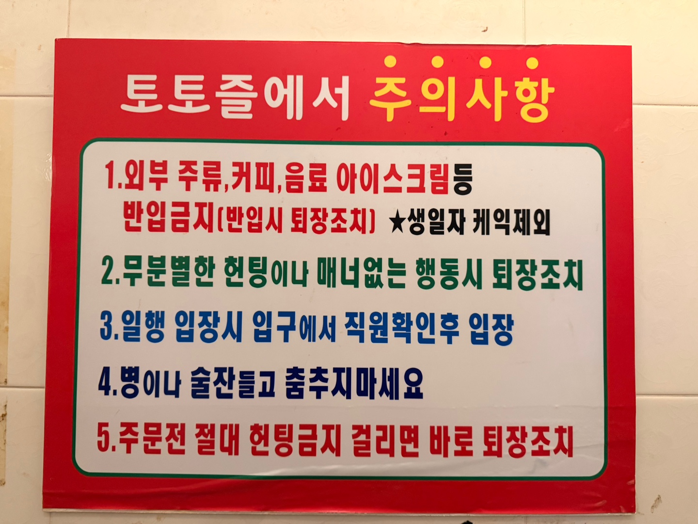 학동에 위치한 토토즐은 여수에서 만큼은 희소성 있는 장소다. 클럽이나 감성주점 등 헌팅을 위한 장소가 드물고 30대 이상이 놀 만한 장소도 적다. 술과 음악, 헌팅이라는 세 박자가 맞는 곳이 '여수 토토즐'이다. 비용은 주말 기준 5만5000원. 5만5000원을 내고 입장하면 나이트클럽에서나 나올 법한 과일 안주와 맥주 몇 명이 제공된다. 나이트클럽과 달리 부킹은 없다.